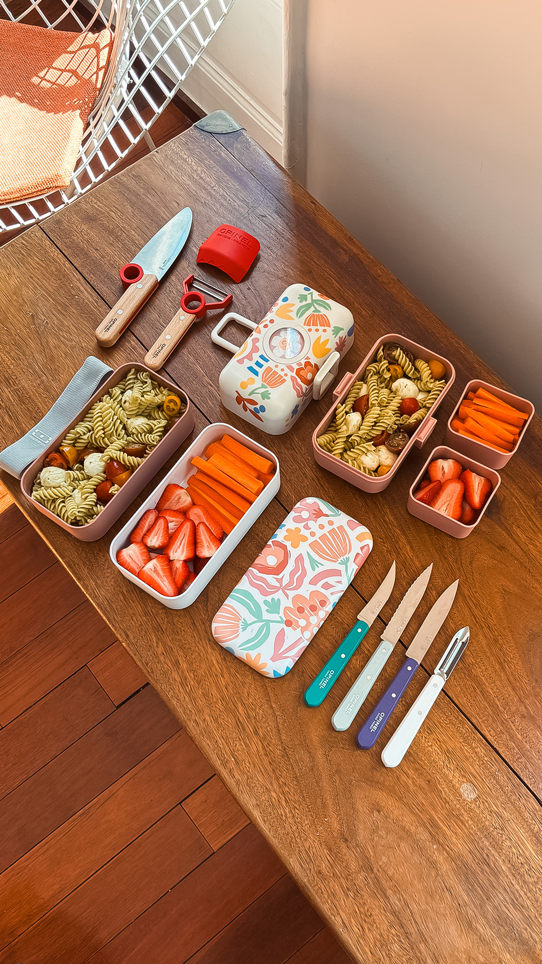 - Découpez des bâtonnets de carottes et fraises pour remplir les deux caissettes du bento enfant Tresor et le second contenant de la lunch box adulte Original.